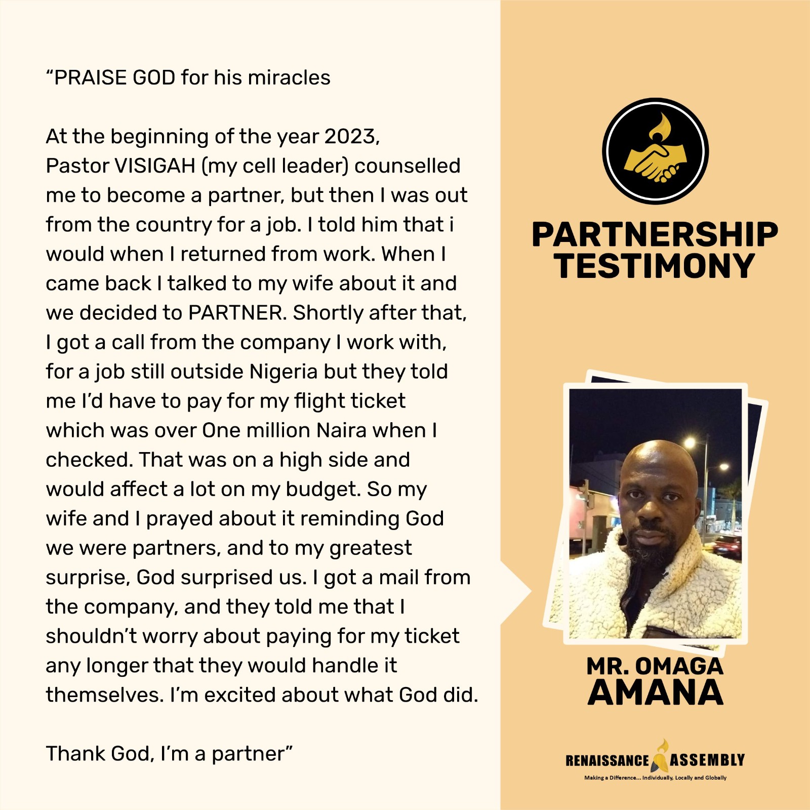 at the beginning of the year 2023, pastor visigah (my cell leader) counselled me to become a partner, but then i was out from the country for a job. i told him that i would when i returned from work. when i came back i talked to my wife about it and we decided to partner. shortly after that, i got a call from the company i work with, for a job still outside nigeria but they told me i'd have to pay for my flight ticket which was over one million naira when i checked. that was on a high side and would affect a lot on my budget. so my wife and i prayed about it reminding god we were partners, and to my greatest surprise, god surprised us. i got a mail from the company, and they told me that i shouldn't worry about paying for the ticket any longer that they would handle it themselves. i'm excited about what god did.